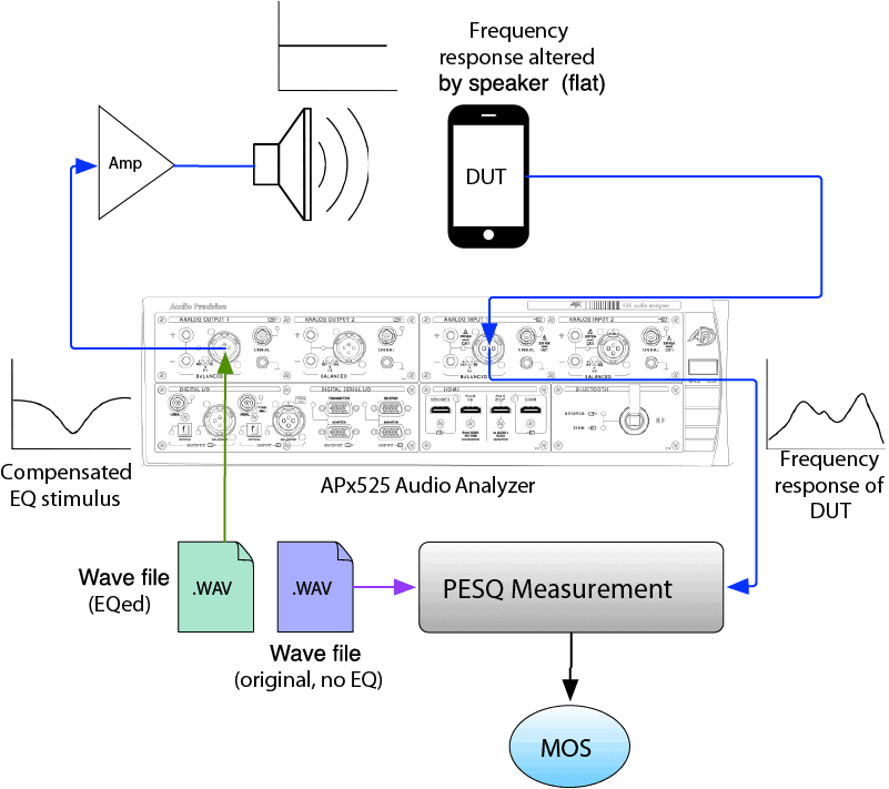 The ability to equalize .wav files is perhaps most valuable for PESQ subjective audio measurements. In APx500, .wav files containing speech samples are used as the generator stimulus signal for the PESQ measurement. PESQ works by comparing the audio received by the analyzer to the original speech samples. By using equalized versions of the speech samples, we can remove response errors introduced by the stimulus speaker and assure that any measured degradation of audio quality due to frequency response errors is caused by the device under test (DUT).