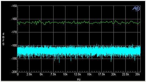 This effect of window scaling is also immediately apparent if you look at the spectrum of a noisy signal measured at two different FFT resolutions, as shown in Figure 3. In this case, the digital generator of a SYS-2722 has been connected via loopback to the digital input with the generator switched off, resulting in a signal containing only broadband noise due to dither. The cyan trace was plotted with an FFT length of 32 k (32,768), and the green trace with an FFT length of 256. If a horizontal line were drawn through the middle of each trace, one would be tempted to conclude that the apparent “noise floor” of the cyan trace is about -184 dBFS, and the green about -163dBFS.