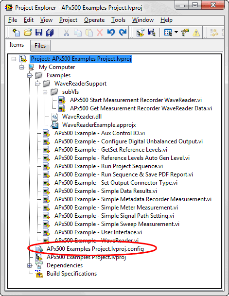 The Examples project shown in the figure above contains a configuration file named APx500 Examples Project.lvproj.config. You can use this file in your own LabVIEW project by simply renaming it. The config file must have the same name as your LabVIEW project, followed by “.config”. For example, if you create a new LabVIEW project named MyAPx500Project.lvproj, make a copy of the .config file above in the same folder as the project and rename it to MyAPx500Project.lvproj.config.