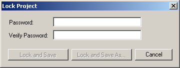 Enter and verify a password. Click Lock and Save to save the file under the current name, or click Lock and Save As... to save the locked version under a new file name. A production operator can use a locked project to start a pre-defined sequence, verify the results on screen, and interact with sequence prompts, without the possibility of changing the sequence itself or the measurements.