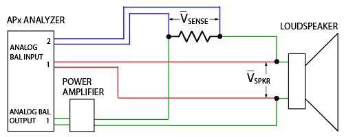 Figure 1 shows a basic schematic of the Constant Voltage method, while Figure 2 shows the actual connections. Two analyzer inputs, configured as analog balanced, are used to make the measurements: One channel measures voltage across the sensing resistor (Vsense), and the other measures voltage across the speaker (Vspkr). The power amplifier provides the ultra-low output impedance and high current necessary to drive low impedance speaker loads. While the analyzer can be used to drive the speaker directly, some combinations of output voltage and speaker impedance may exceed its maximum output current. In addition, the minimum 50 Ω output impedance of the analyzer feeding a speaker creates a current source, defeating the main advantage of the Constant Voltage method.