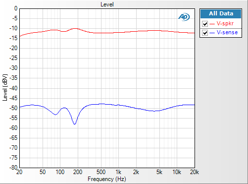 In the accompanying project file "LoudspeakerImpedance.approjx", the impedance is derived from the Level result in the Acoustic Response measurement (Figure 4). In practice, any of the frequency response measurements could be used—Acoustic Response was chosen because it is fast and allows multiple averages to be taken. Note that because this is not really an acoustic measurement, the Time Window setting on the Impulse Response and Energy Time Curve measurements is not relevant. It should therefore be set to the same value as the sweep time. In this project file, a sweep time of 1.0 seconds has been set. As shown, the input channels have been re-labeled in Signal Path Setup to Vspkr and Vsense, for convenience.