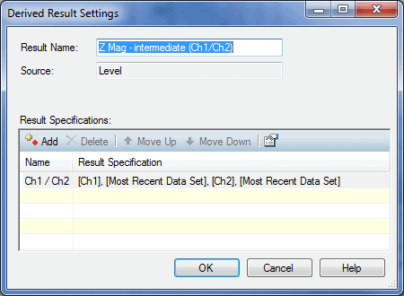 To get the impedance magnitude (Figure 6), we first use an intermediate derived result named Z Mag – intermediate (Ch1/Ch2) (Figure 5). This is a Compare derived result, and simply divides Ch1 by Ch2 (Vspkr/Vsense). Next, we use an Offset derived result to multiply the intermediate derived result by Rsense. In this case, we need to multiply the result by 0.1 Ω. A multiplication by 0.1 is equivalent to an offset of -20 dB. Hence a gain of -20 dB was applied to the offset operation as shown in Figure 6. If other values of Rsense are used, the gain for this offset operation should be set according to the equation