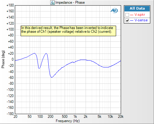 Finally, to get the impedance phase (Figure 7), we used an Invert derived result on the primary Phase result. This is to correct for the fact that the primary phase result is the phase of channel 2 relative to channel 1, and in this case we want the phase of the speaker voltage (channel 1) relative to the current (channel 2). Alternatively, we could have just swapped the two measurement channels and this invert operation would not have been required.
