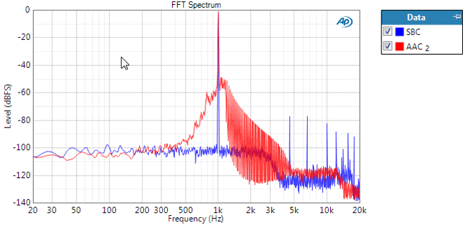 Figure 1. FFT of a 1 kHz sine signal transmitted over Bluetooth A2DP using the SBC and AAC codecs.