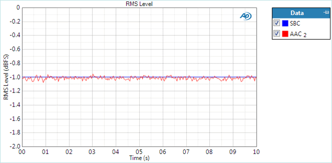 This modulation can also be reduced by setting the AAC codec to use a fixed bit rate rather than a variable bit rate. The graphs shown here were measured with the AAC codec set to variable bit rate. When tested with the AAC codec in fixed bit rate mode, the amplitude modulation was reduced from about 5% to 1.5%).