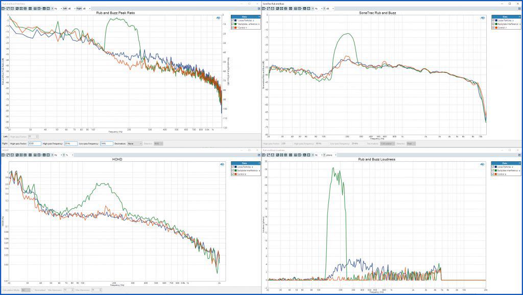 With the release of APx500 software version 6.1, Audio Precision now offers the broadest set of rub & buzz defect detection methodologies available to speaker designers and manufacturers: Rub & Buzz (upper left), SoneTrac (upper right), High-Order Harmonic Distortion (lower left), and Rub & Buzz Loudness (lower right). Click for larger image.