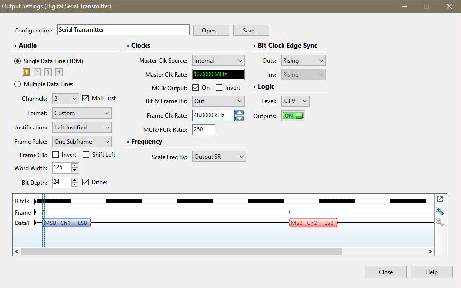 The APx DSIO option automatically calculates certain related items, such as Master Clock rate based upon the MClk/FClk ratio. Additionally, the frame clock (our 48kHz audio data rate) may be defined with a specified pulse width of 50% (instead of 1 sample) and may be inverted to exchange rising and falling edges.