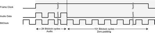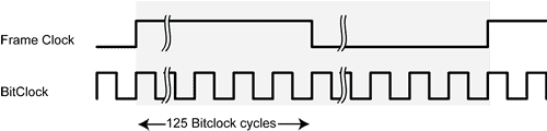 Each half-cycle of the Frame Clock (FClk) is represented by 125 cycles of the bitclock; as with I2S and other formats, FClk states are used to signal the two different channels. Thus we effectively have created a system that delivers 125-bit words at 48 kHz. Actual audio data with word length n is transmitted in the first n bitclock cycles, and the remaining (125-n) samples of the word are padded with zeros.