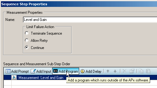 APx500 has a great feature that can be used to call an external application from any measurement in a project file. To use it, right click on the measurement at the point in the sequence where you want to call the application and select Edit Prompts and Properties. This will open the Sequence Step Properties window. To insert a step that calls an external application, click on the Add Program button on the toolbar (Figure 1).