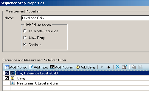 To make sure that the track is playing before APx starts the measurement, you can add a delay sub-step to the sequence step as shown in Figure 3. In this case a delay of 1 second was used. Now the measurement is completely automated and takes less than 2 seconds to complete.
