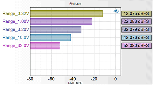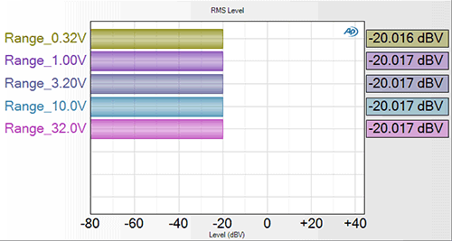 To illustrate how this scaling works, we recorded a series of five .wav files in loopback mode with the analyzer set to a different input range for each file. (The APx585 used in this case has input ranges of 0.32, 1.0, 3.2, 10.0, and 32 Vrms.) For all five recordings, the generator was set to generate a 1 kHz sine wave at -20.0 dBV (100 mVrms). Figure 1 shows the RMS Level results from analyzing these five .wav files with the Input Connector set to File (Analog Units). As shown, for all five files, the analyzer returns the correctly scaled result of -20 dBV.