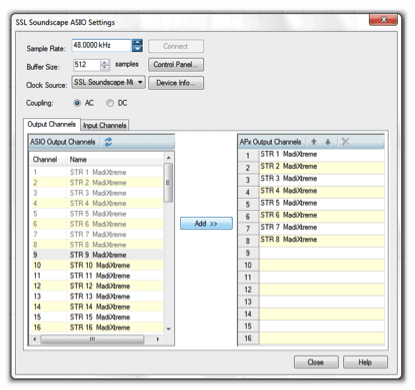 - Click the Settings button and select the desired Sample Rate, Buffer Size, Clock Source, and Coupling settings. Using the SSL Soundscape ASIO Settings dialog window, you must also assign the Output (or Input) Channels. Note with APx515 hardware connected you are limited to two simultaneous channels, using all other APx models you may use up to 16 simultaneous channels.