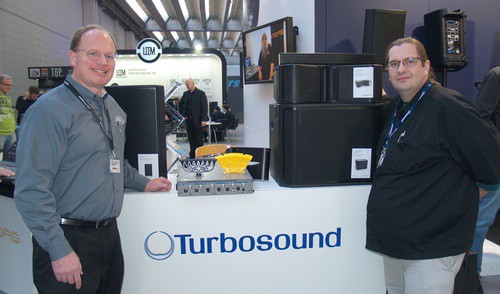(L-R) Dave Schmoldt, President, Audio Precision – Howard Smart, Engineer, System Solutions Professional Division, Turbosound with APx Audio Analyzer on the Turbosound Booth, ProLight+Sound
