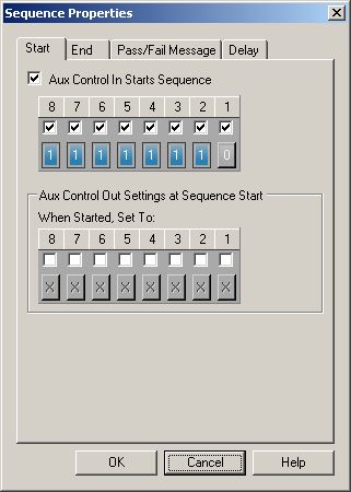 Select Project > Sequence Properties from the menus, or right-click on the project name at the top of the measurement navigator tree to open the Sequence Properties window. On the Start tab, check Aux Control In Starts Sequence, and then check the boxes for each of the Aux Control In lines (1 – 8). Then, set lines 2 – 7 to logic high (a value of 1), and leave line 1 set to low (a value of zero).