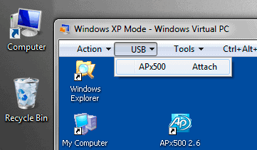 4. Start the Virtual PC in XP Mode. From within the Virtual PC window, install the APx500 control software.